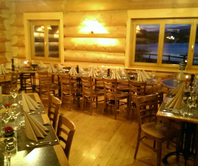 Après avoir suivi une petite route à travers bois, la restaurant « L’Unique » se présente avec une construction toute en bois. Nous sommes à La Roche, au bord du lac de Gruyères. Le coucher de soleil est plus beau en vrai que sur la photo, à travers la vitre du car !!!